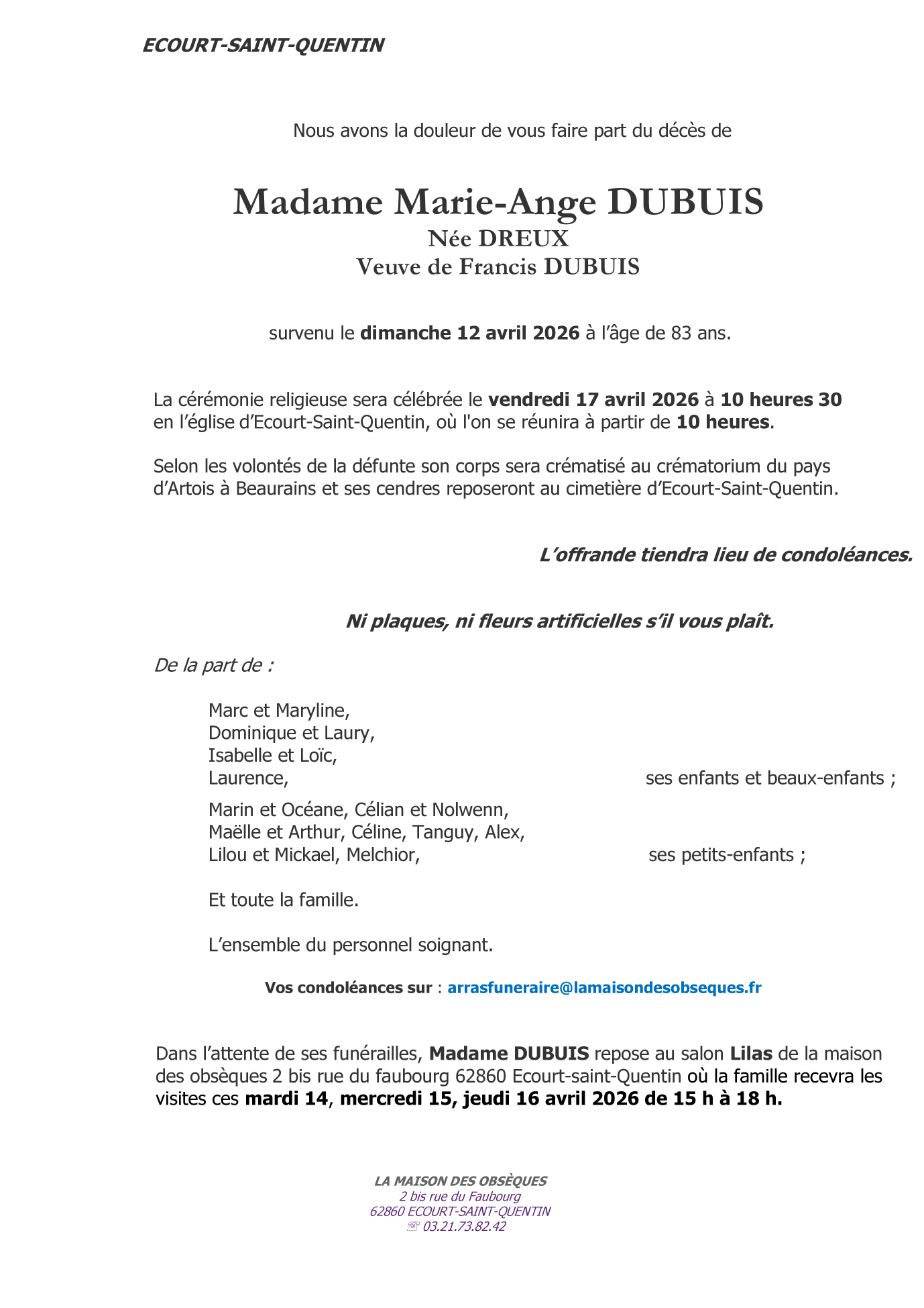 Avis de décès de Madame Marie-Ange DUBUIS née DREUX