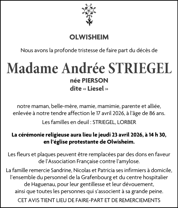 Avis de décès de Madame Andrée STRIEGEL née PIERSON