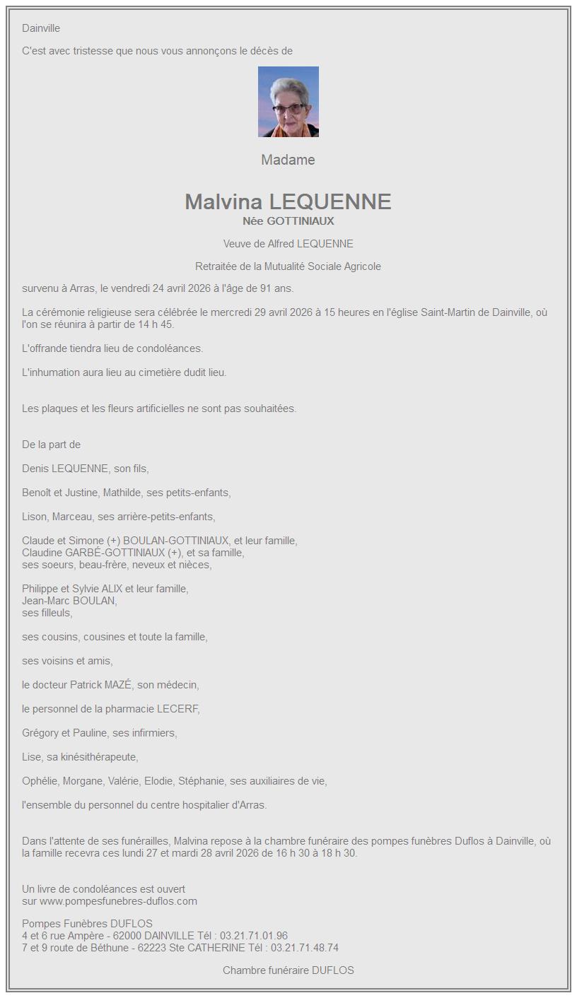 Avis de décès de Madame Malvina LEQUENNE née GOTTINIAUX