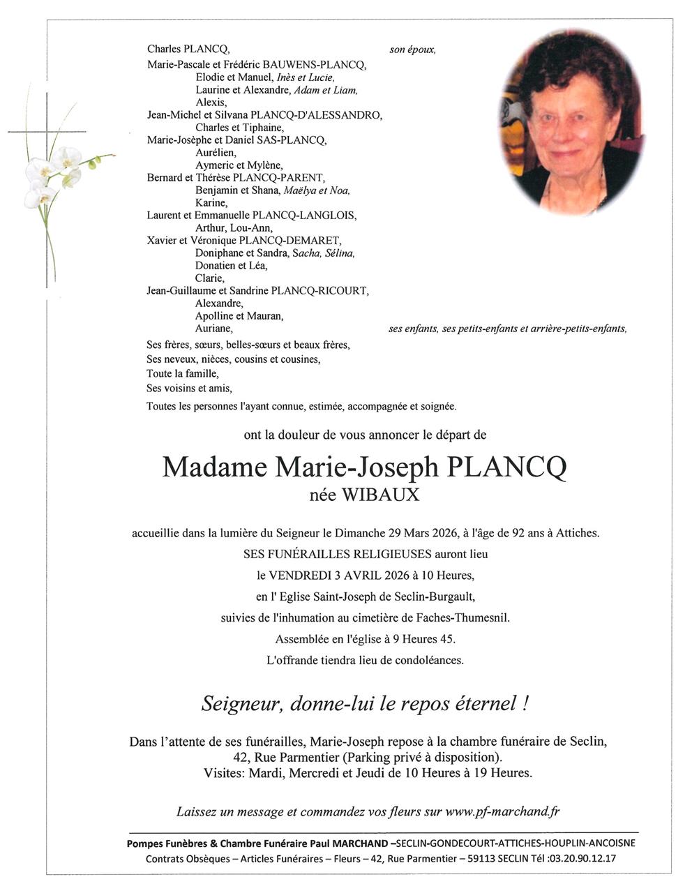 Avis de décès de Madame Marie-Joseph PLANCQ née WIBAUX