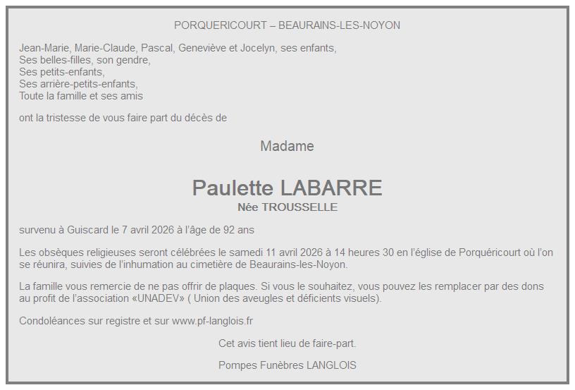 Overlijdensbericht van Madame Paulette LABARRE geboren TROUSSELLE