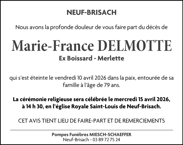 Décédée à Colmar (68000) le vendredi 10 avril 2026 à l'âge de 79 ans