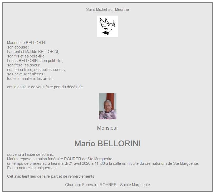 Avis de décès de Monsieur Mario BELLORINI