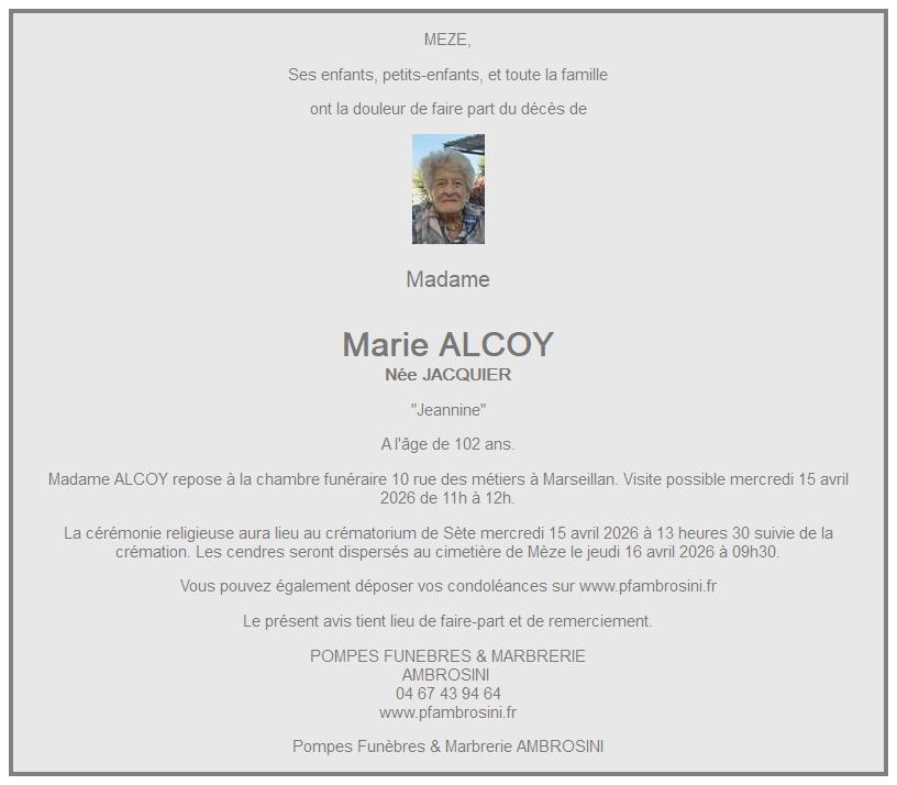 Avis de décès de Madame Marie ALCOY née JACQUIER