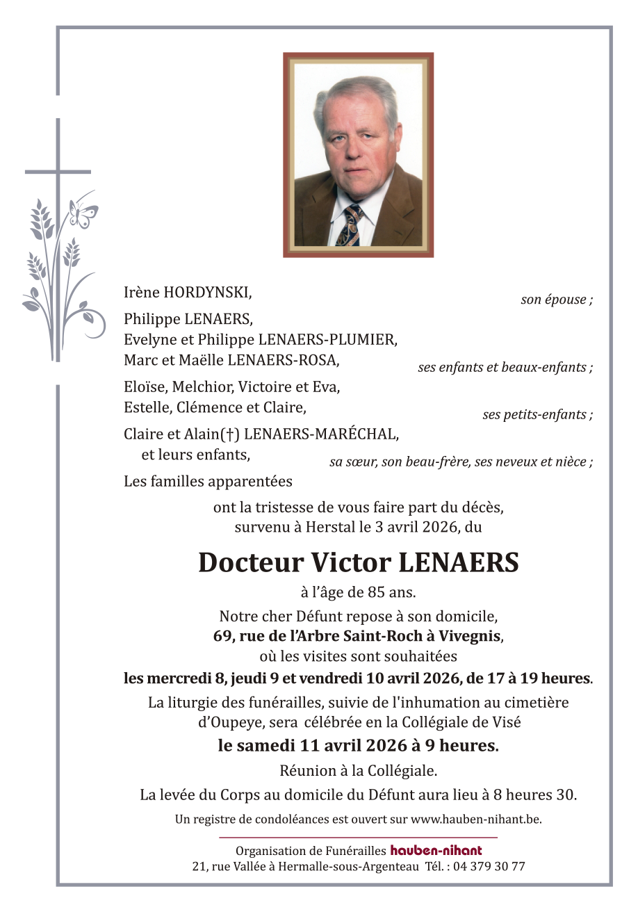Visites, Les visites sont souhaitées les mercredi 8, jeudi 9 et vendredi 10 avril 2026, de 17 à 19 heures au domicile du Défunt, 69, rue de l'Arbre Saint-Roch à Vivegnis.