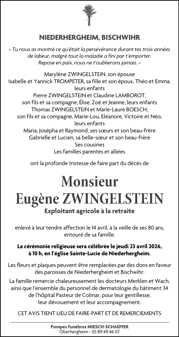 Avis de décès de Monsieur Eugène ZWINGELSTEIN