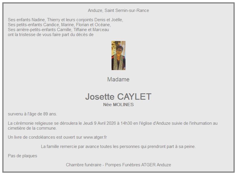 Overlijdensbericht van Madame Josette CAYLET geboren MOLINES