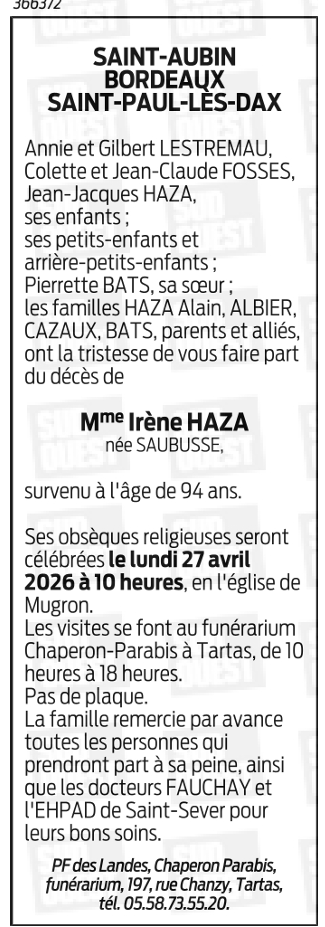 Avis de décès de Madame Marie, Irène HAZA née SAUBUSSE