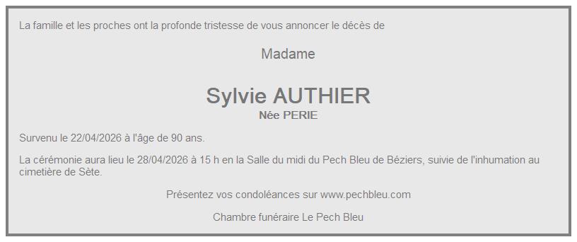 Avis de décès de Madame Sylvie AUTHIER née PERIE