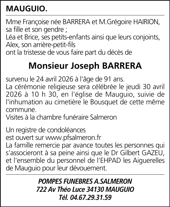 Décédé à Castelnau-le-Lez (34170) le vendredi 24 avril 2026 à l'âge de 91 ans