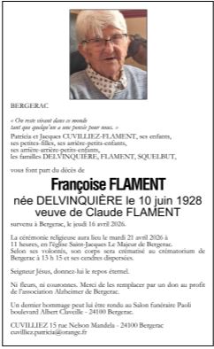 Avis de décès de Madame Françoise FLAMENT née DELVINQUIERE