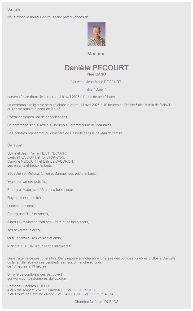 Décédée à Dainville (62000) le mercredi 8 avril 2026 à l'âge de 80 ans