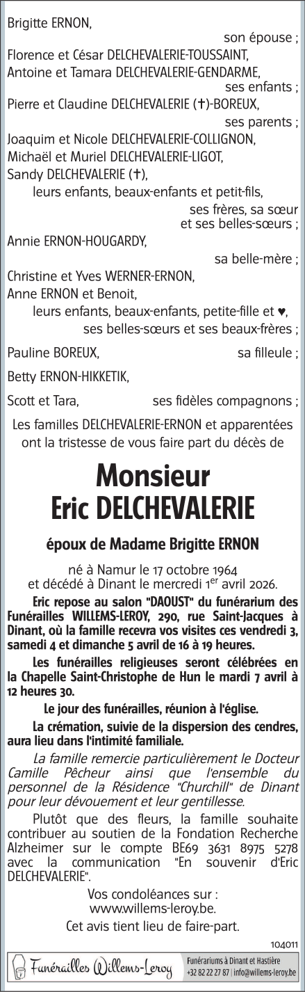 Avis de décès de Monsieur Eric DELCHEVALERIE