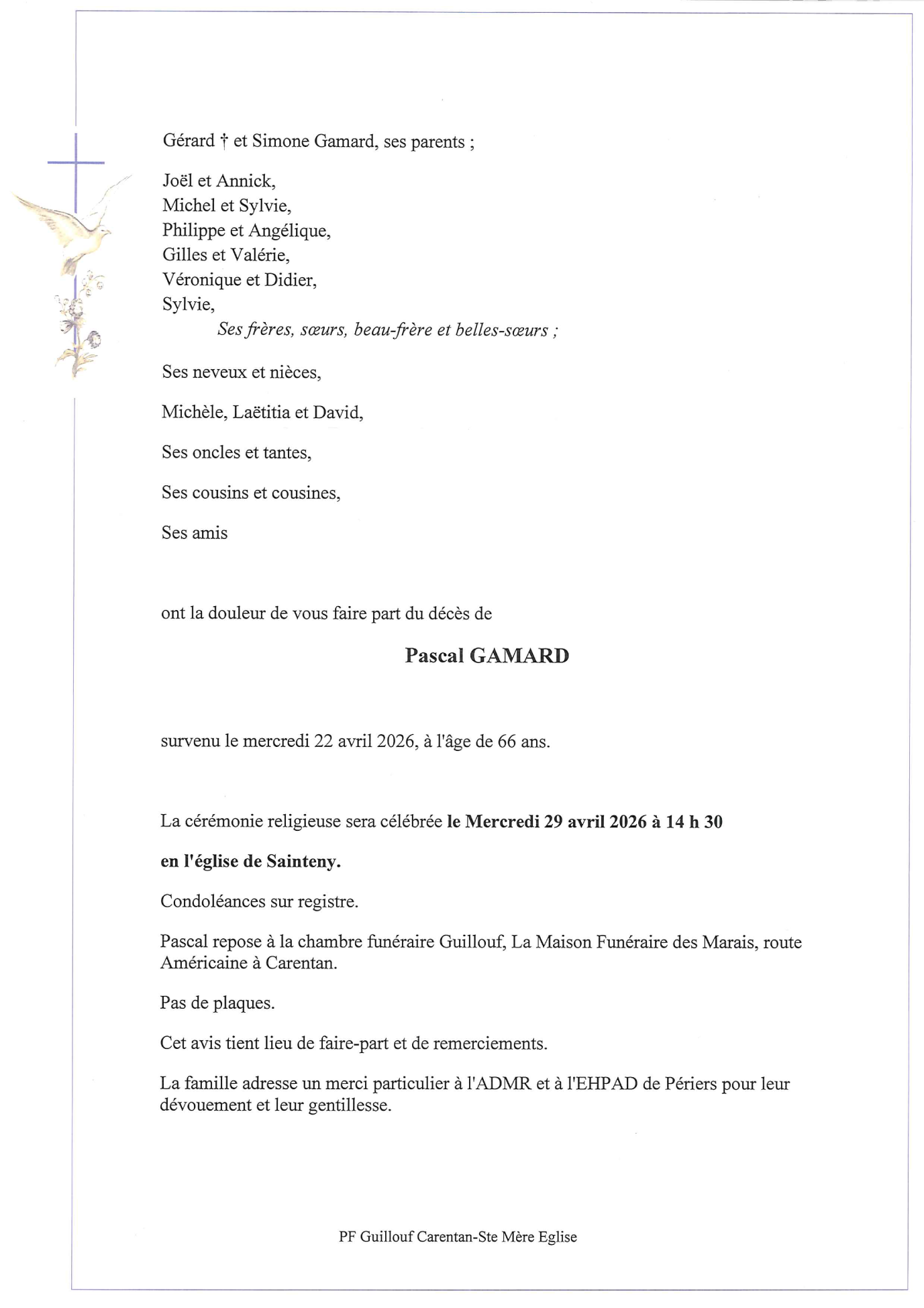Avis de décès de Monsieur Pascal GAMARD
