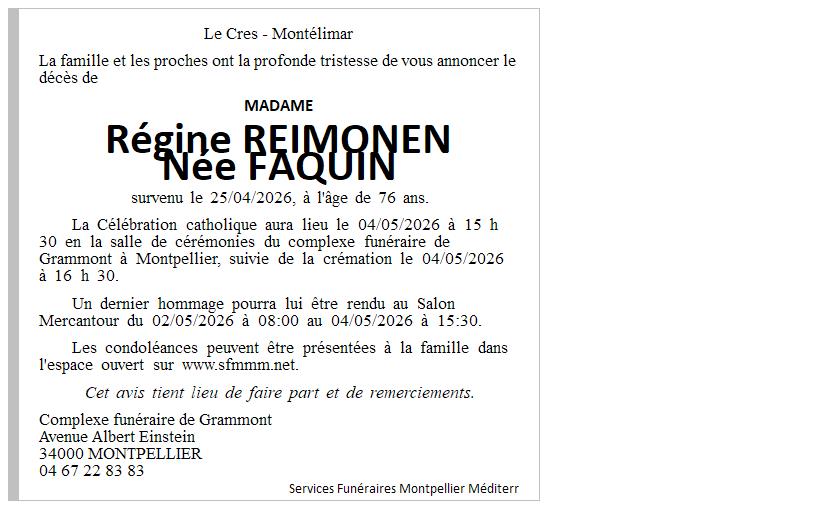 Avis de décès de Madame Régine REIMONEN née FAQUIN