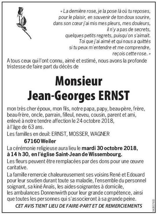 Décédé à Haguenau (67500) le mercredi 24 octobre 2018 à l'âge de 63 ans