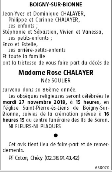Veuve de Monsieur Jean-Pierre CHALAYER