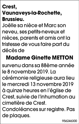Décédée à Valence (26000) le vendredi 8 novembre 2019 à l'âge de 87 ans
