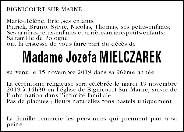 Veuve de Monsieur Jozef MIELCZAREK