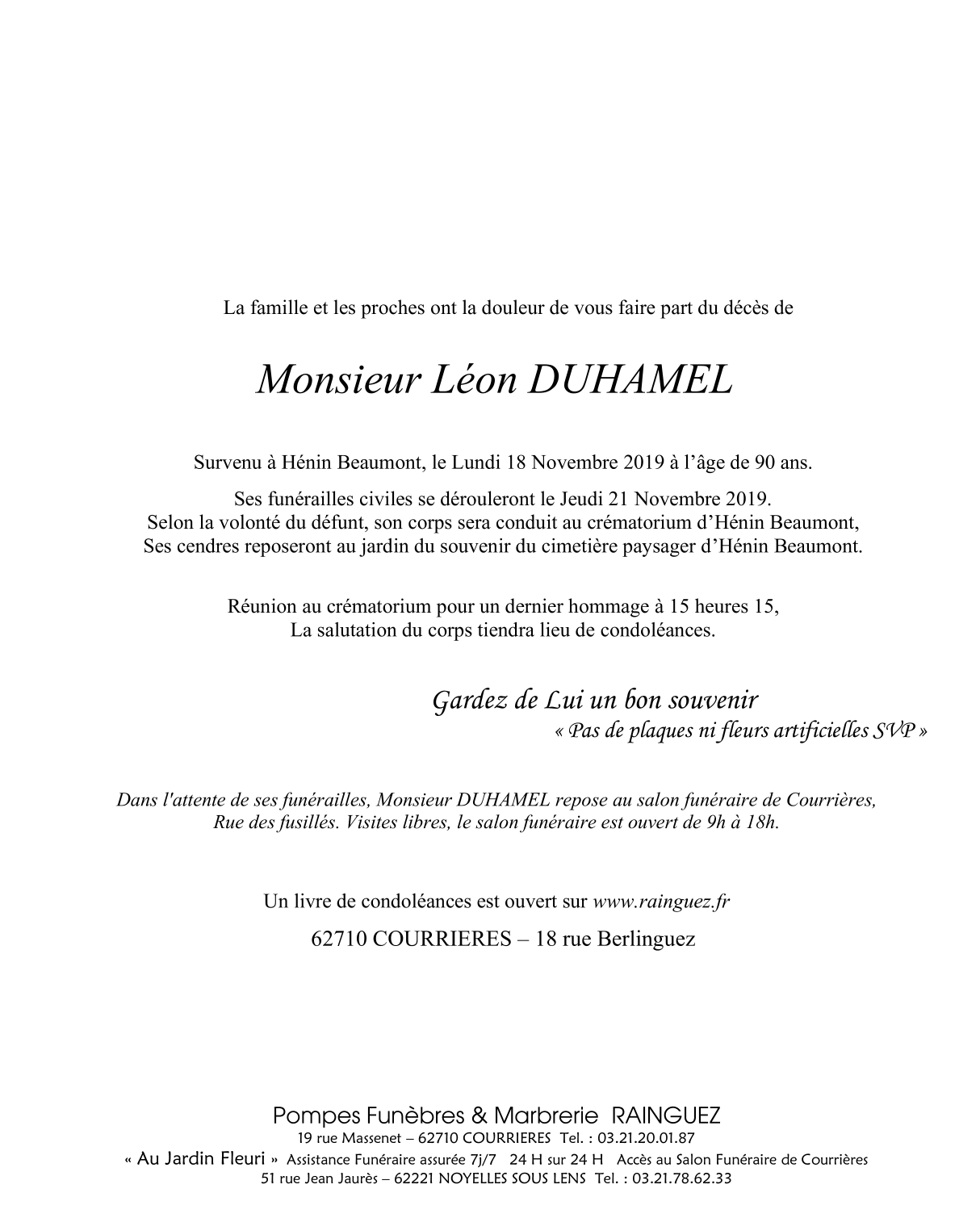 Décédé à Hénin-Beaumont (62110) le lundi 18 novembre 2019 à l'âge de 90 ans