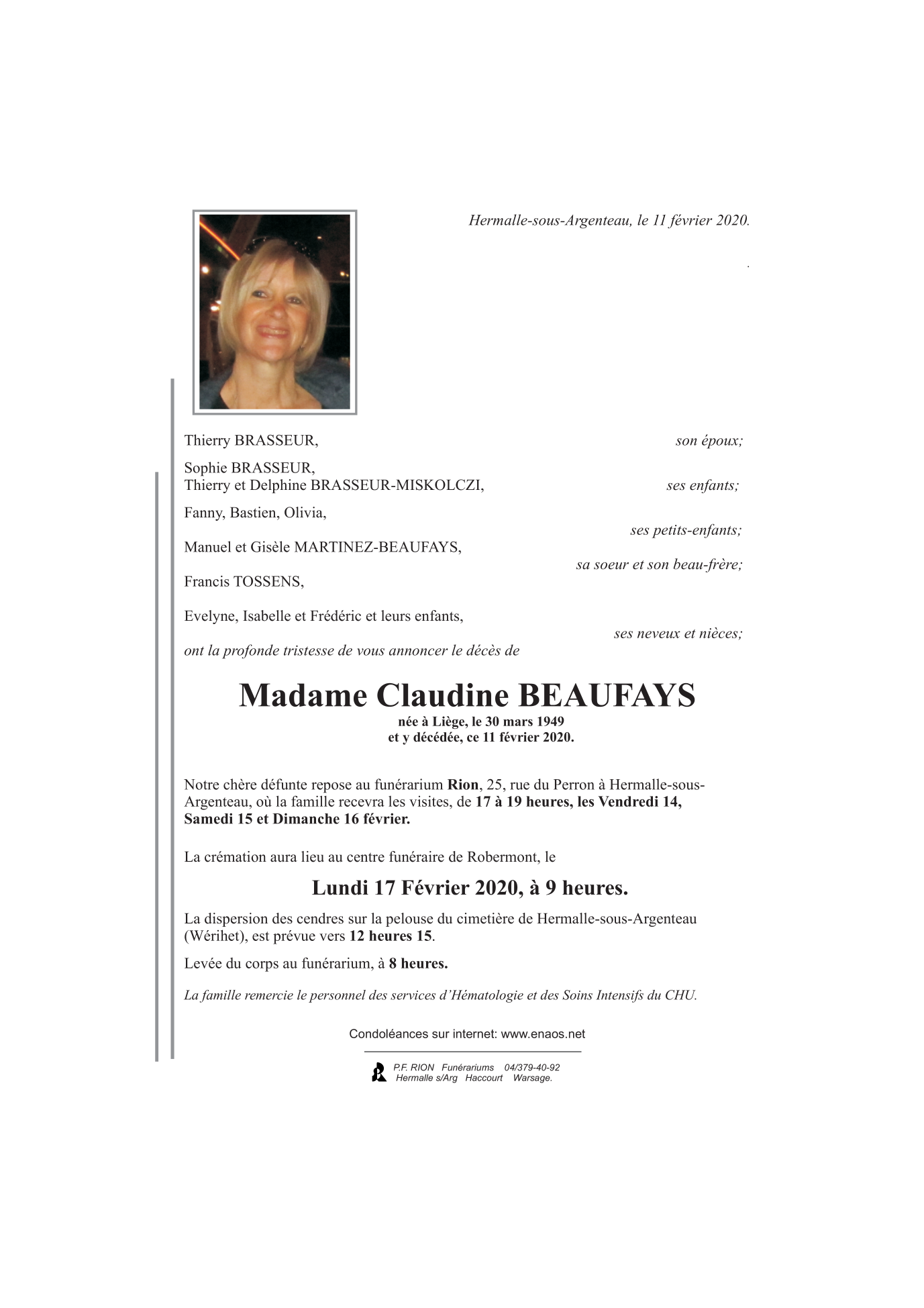 Décédée à Liège (4000, Belgique) le mardi 11 février 2020 à l'âge de 70 ans