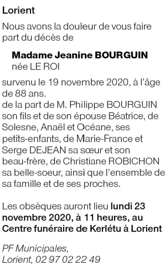 Décédée à Ploemeur (56270) le jeudi 19 novembre 2020 à l'âge de 88 ans