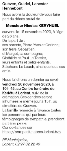 Décédé à Ploemeur (56270) le dimanche 15 novembre 2020 à l'âge de 26 ans