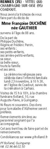 Décédée à Pabu (22200) le jeudi 19 novembre 2020 à l'âge de 88 ans