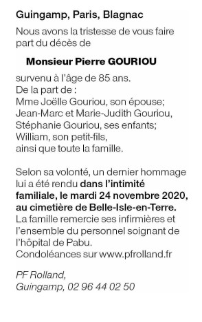 Décédé à Pabu (22200) le vendredi 20 novembre 2020 à l'âge de 85 ans