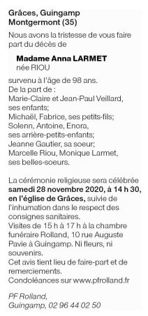 Décédée à Graces (22200) le mercredi 25 novembre 2020 à l'âge de 98 ans