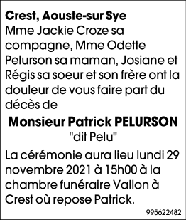Décédé à Crest (26400) le jeudi 25 novembre 2021 à l'âge de 60 ans