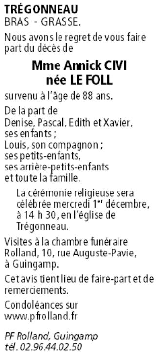 Décédée à Pabu (22200) le dimanche 28 novembre 2021 à l'âge de 88 ans