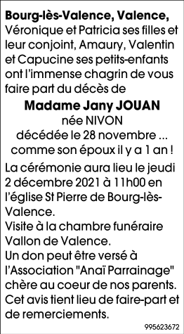 Décédée à Valence (26000) le dimanche 28 novembre 2021 à l'âge de 87 ans