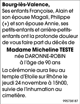 Décédée à Bourg-lès-Valence (26500) le dimanche 20 novembre 2022 à l'âge de 90 ans