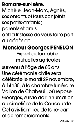 Décédé à Romans-sur-Isère (26100) le jeudi 24 novembre 2022 à l'âge de 85 ans
