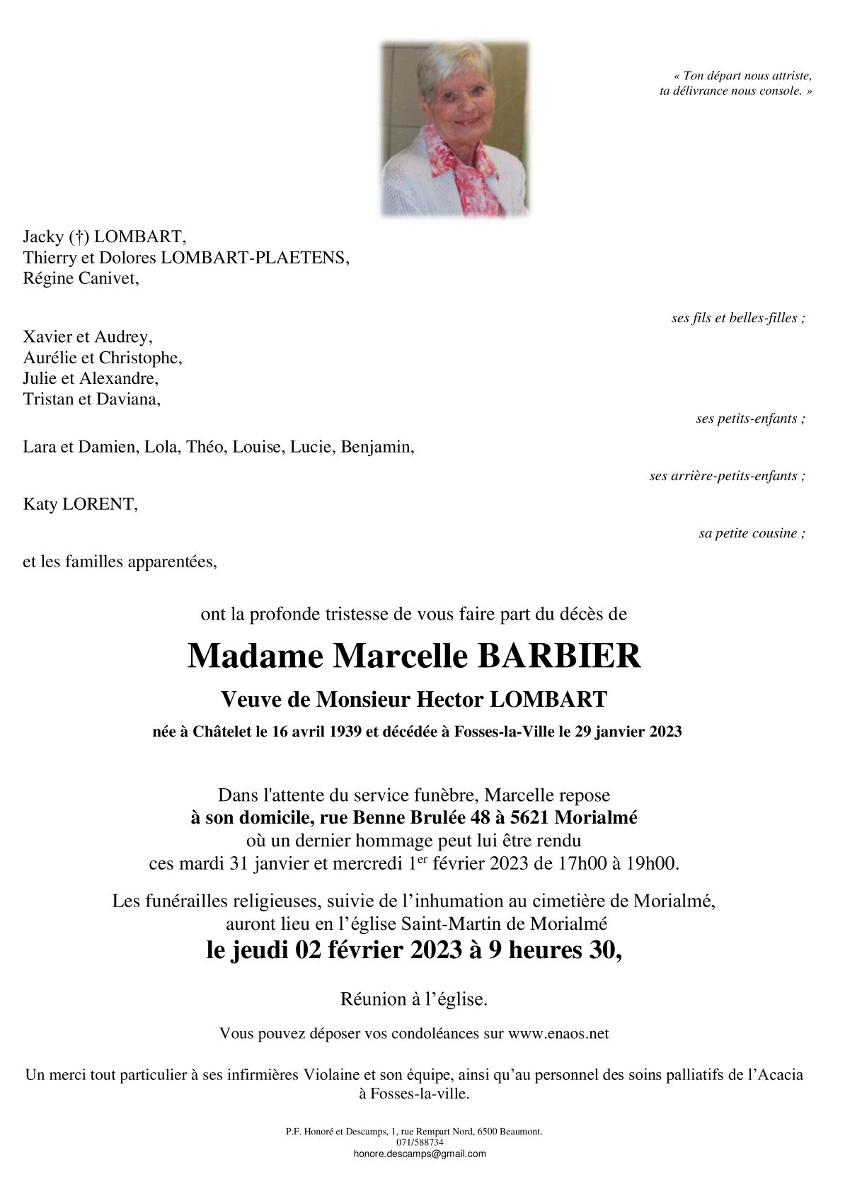Décédée à Fosses-la-Ville (5070, Belgique) le dimanche 29 janvier 2023 à l'âge de 83 ans