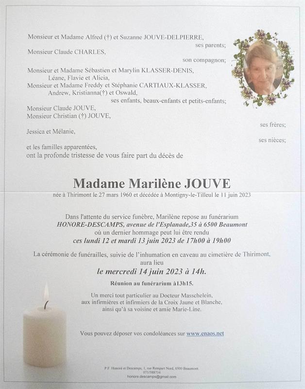 Décédée à Montigny-le-Tilleul (6110, Belgique) le dimanche 11 juin 2023 à l'âge de 63 ans