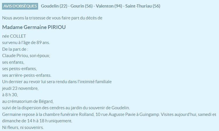 Décédée à Châtelaudren-Plouagat (22170) le jeudi 16 novembre 2023 à l'âge de 89 ans