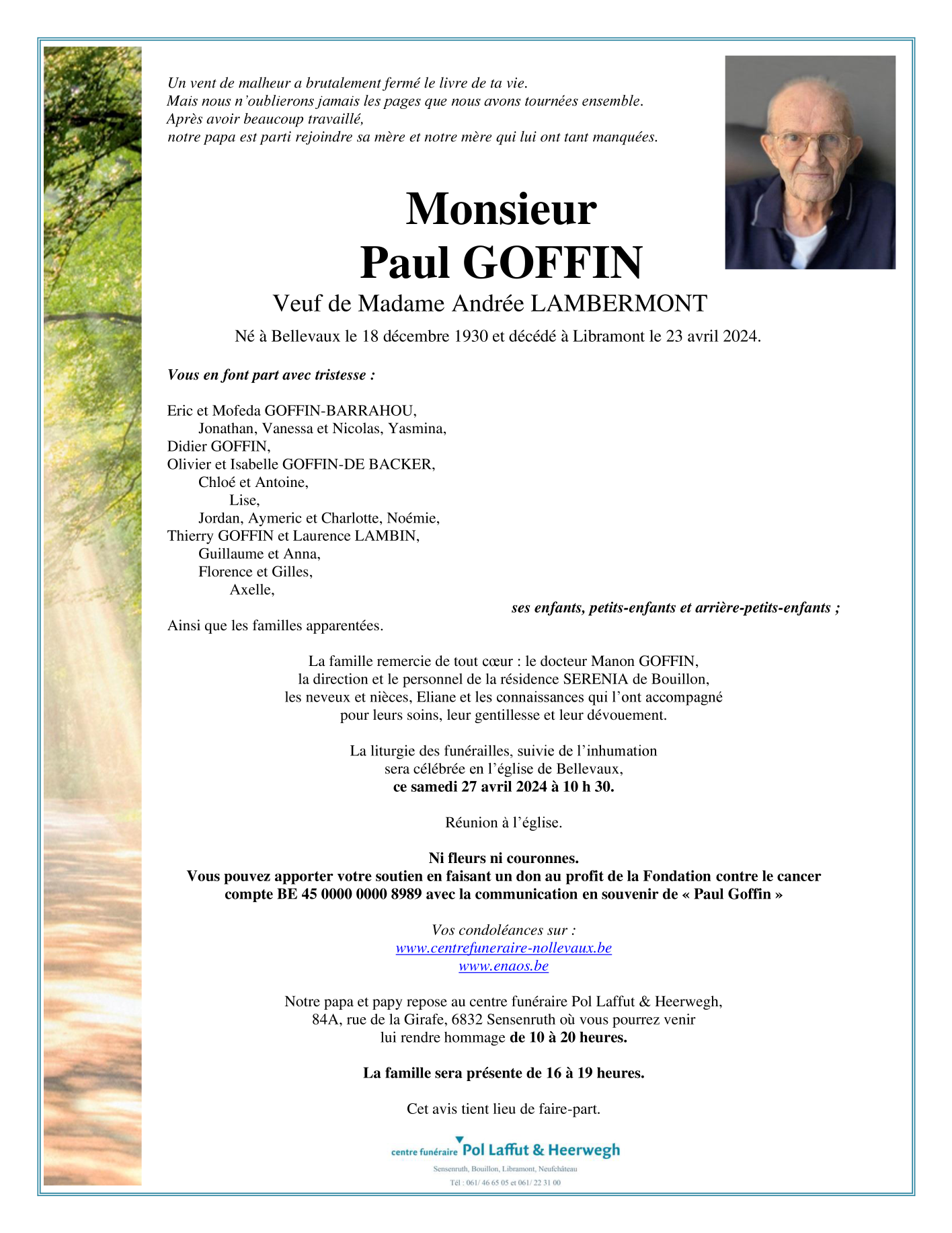 Décédé à Libramont-Chevigny (6800, Belgique) le mardi 23 avril 2024 à l'âge de 93 ans
