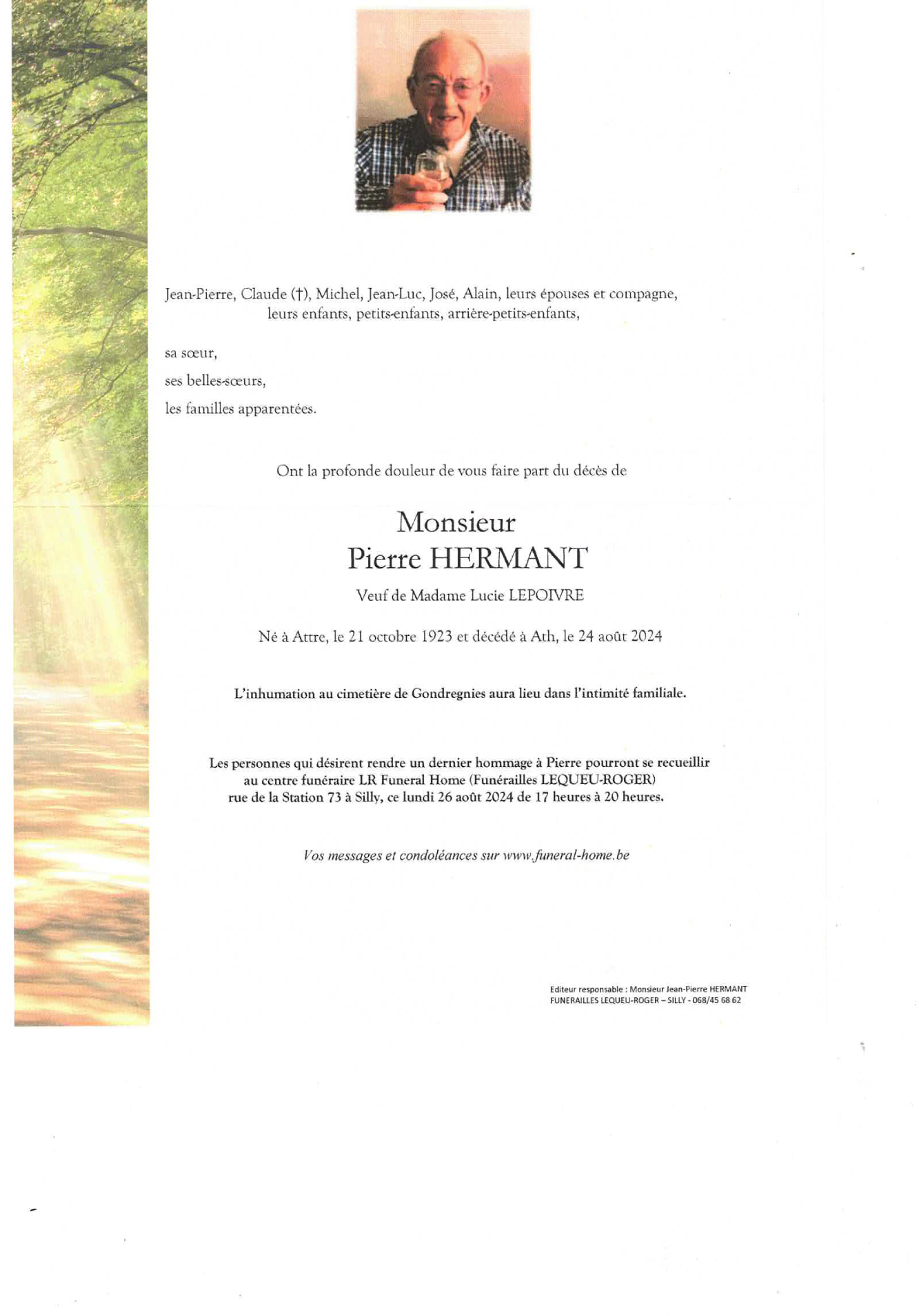 Décédé à Ath (7800, Belgique) le samedi 24 août 2024 à l'âge de 100 ans
