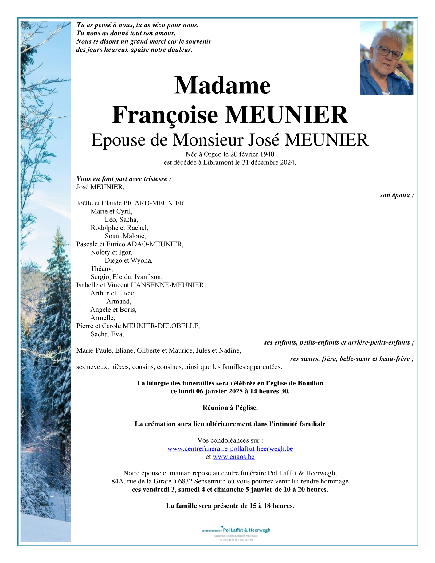 Décédée à Libramont-Chevigny (6800, Belgique) le mardi 31 décembre 2024 à l'âge de 84 ans