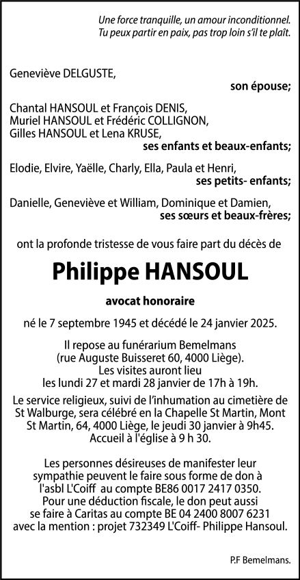 Décédé à Liège (4000, Belgique) le vendredi 24 janvier 2025 à l'âge de 79 ans