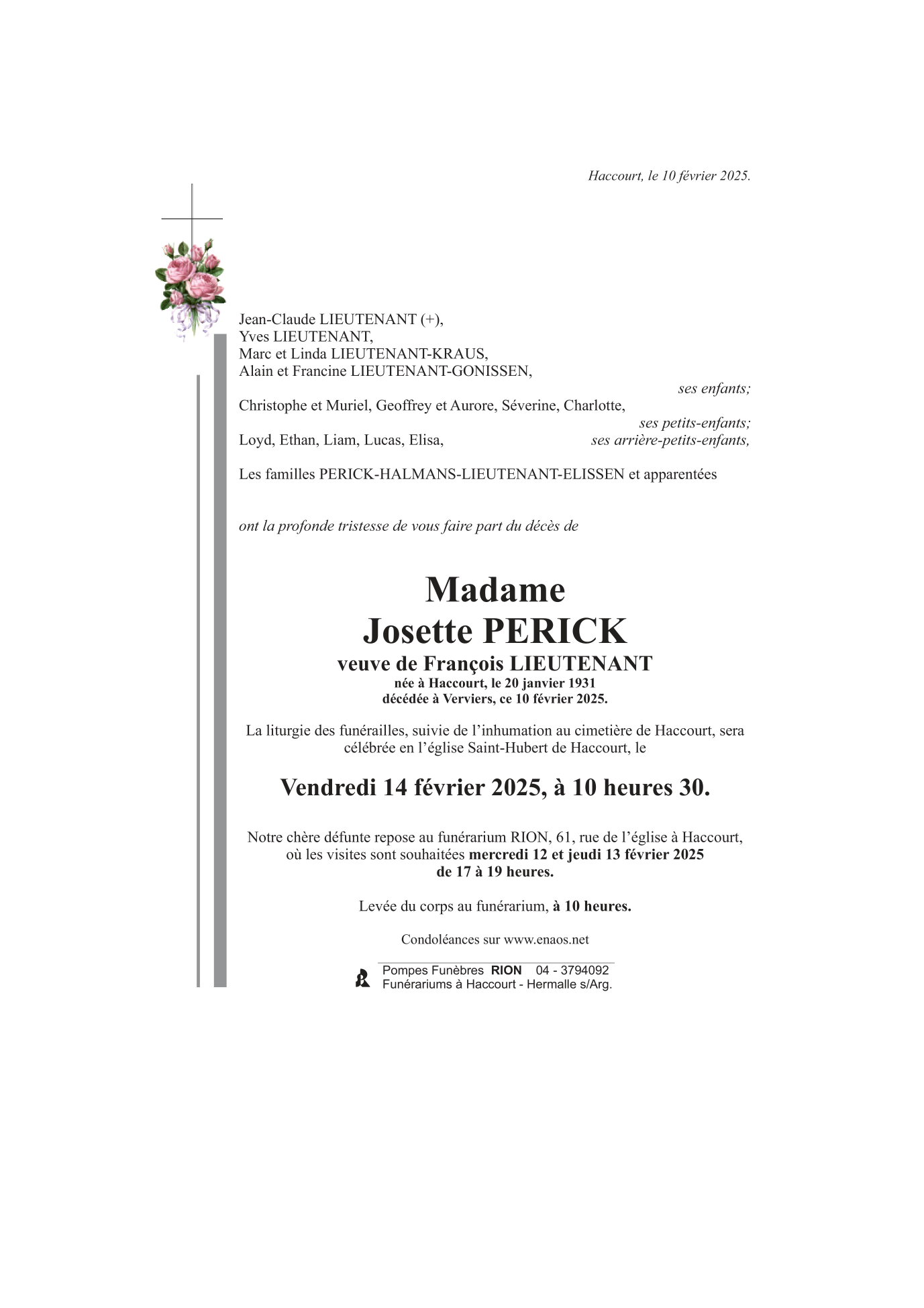 Décédée à Verviers (4800, Belgique) le lundi 10 février 2025 à l'âge de 94 ans