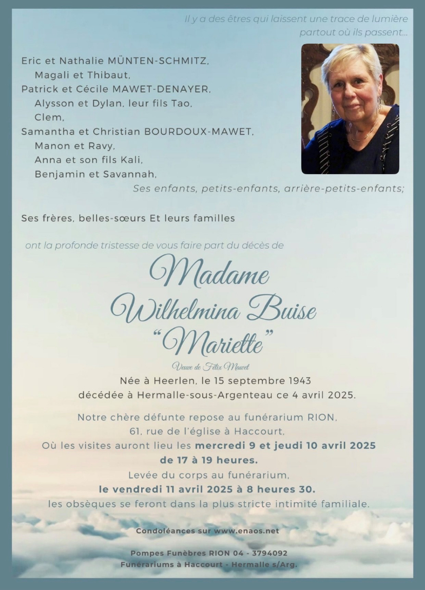 Décédée à Hermalle-sous-Argenteau (4681, Belgique) le vendredi 4 avril 2025 à l'âge de 81 ans