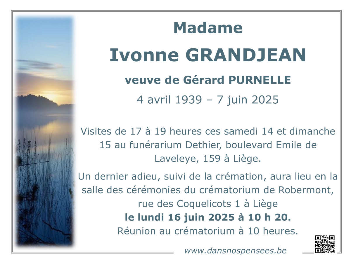 Décédée à Liège (4020, Belgique) le samedi 7 juin 2025 à l'âge de 86 ans