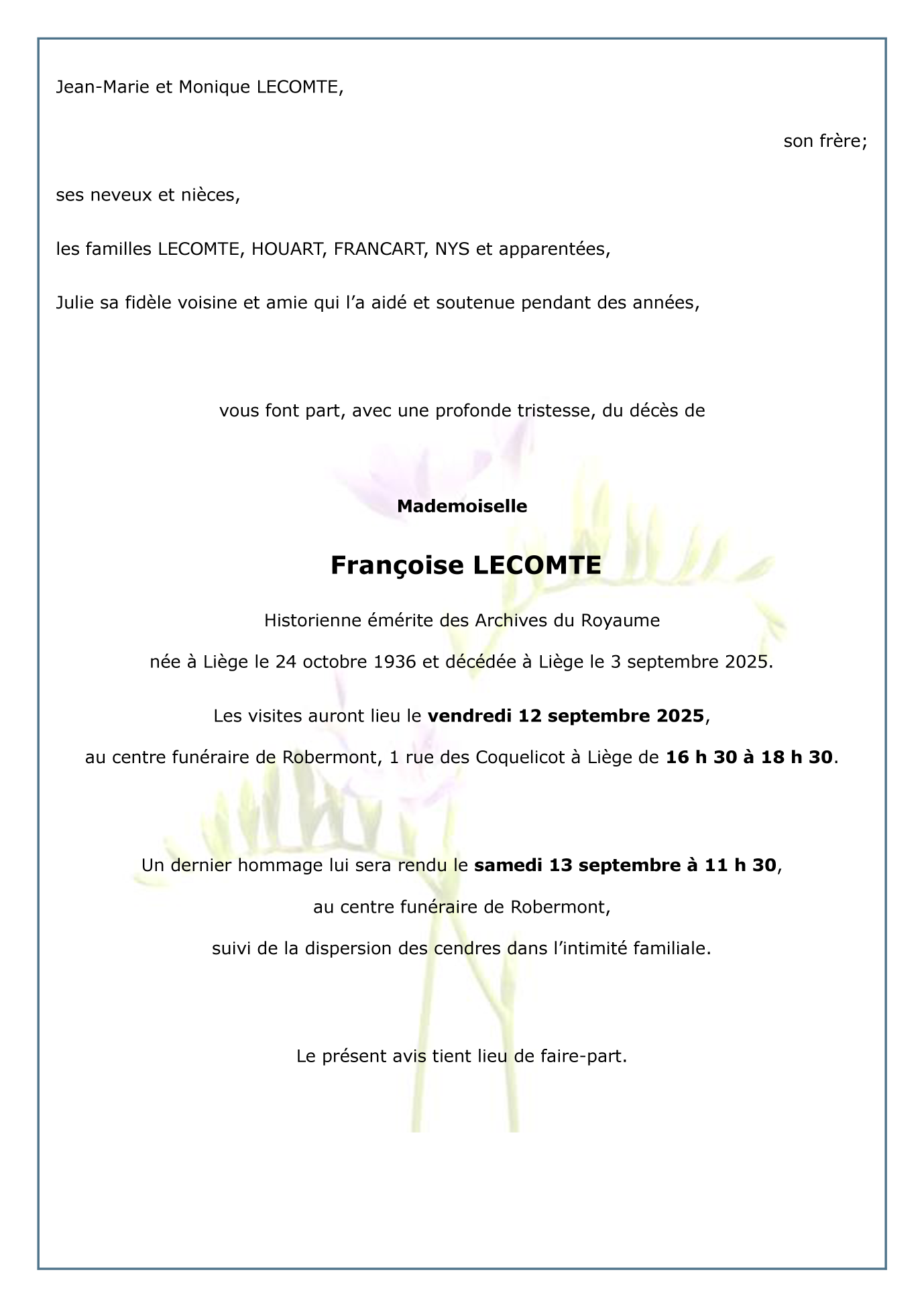 Décédée à Liège (4000, Belgique) le mercredi 3 septembre 2025 à l'âge de 88 ans