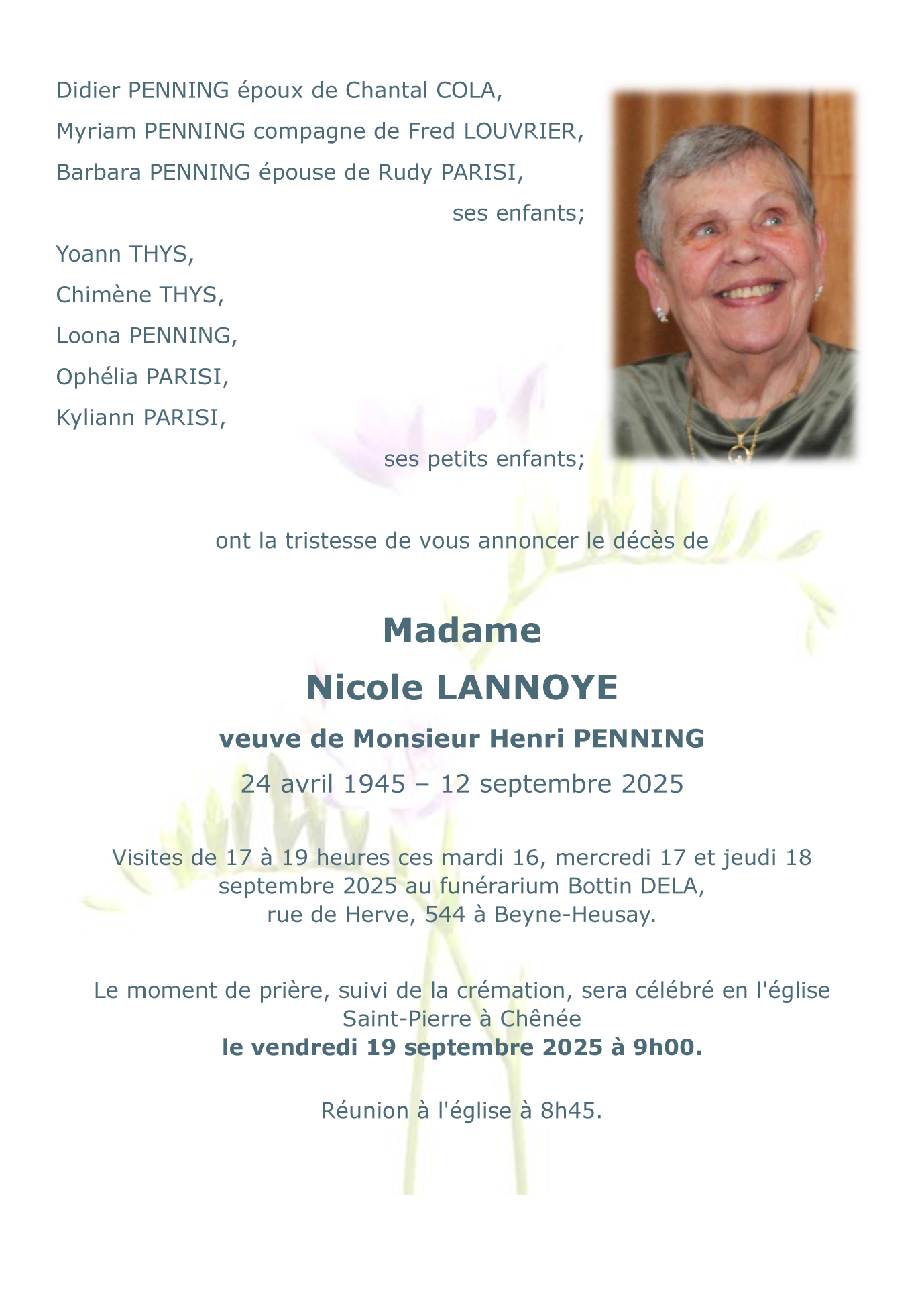 Décédée à Beyne-Heusay (4610, Belgique) le vendredi 12 septembre 2025 à l'âge de 80 ans