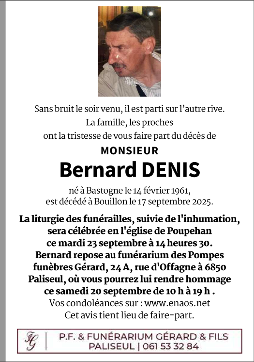 Décédé à Bouillon (6830, Belgique) le jeudi 18 septembre 2025 à l'âge de 64 ans