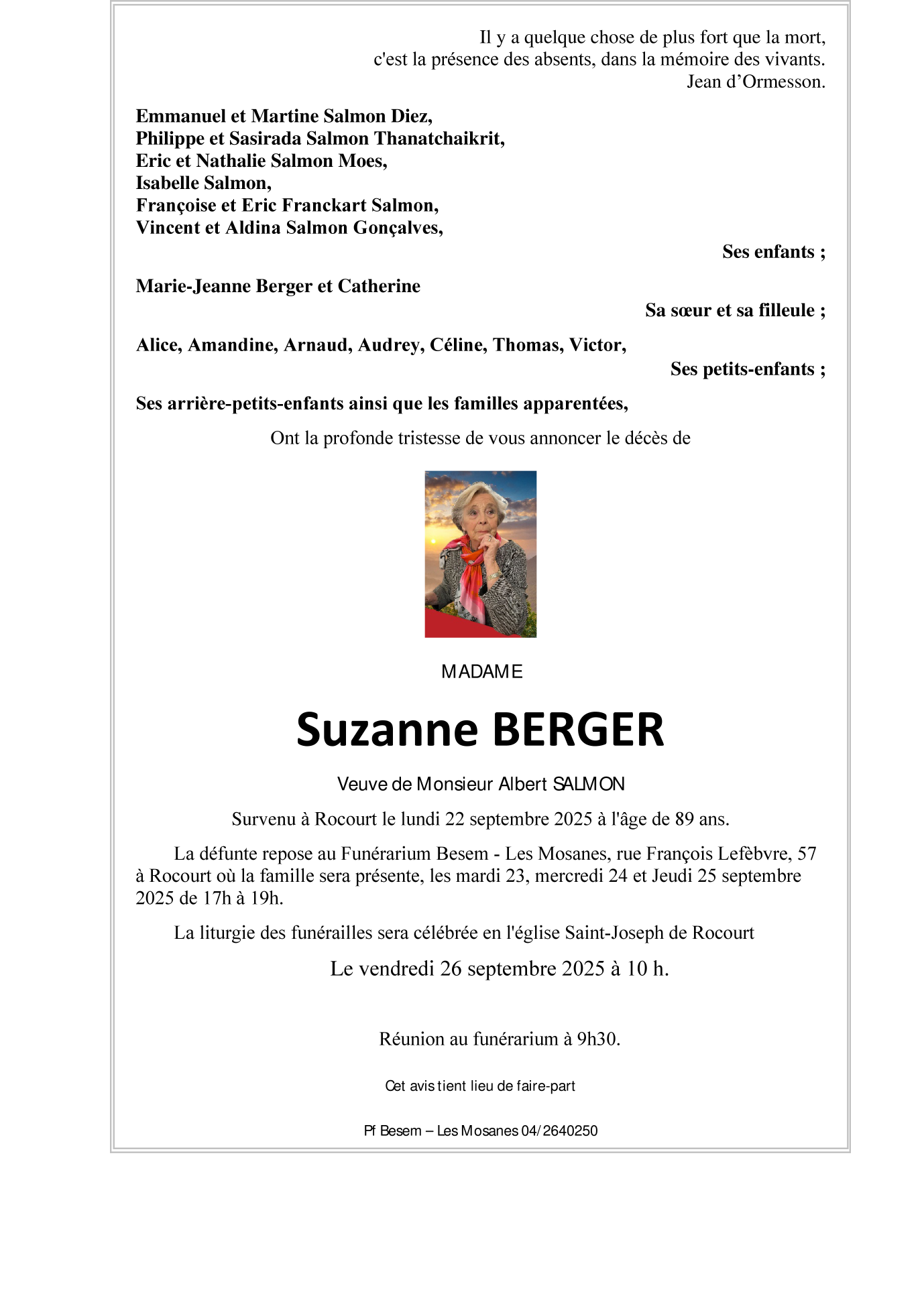 Décédée à Rocourt (4000, Belgique) le lundi 22 septembre 2025 à l'âge de 89 ans