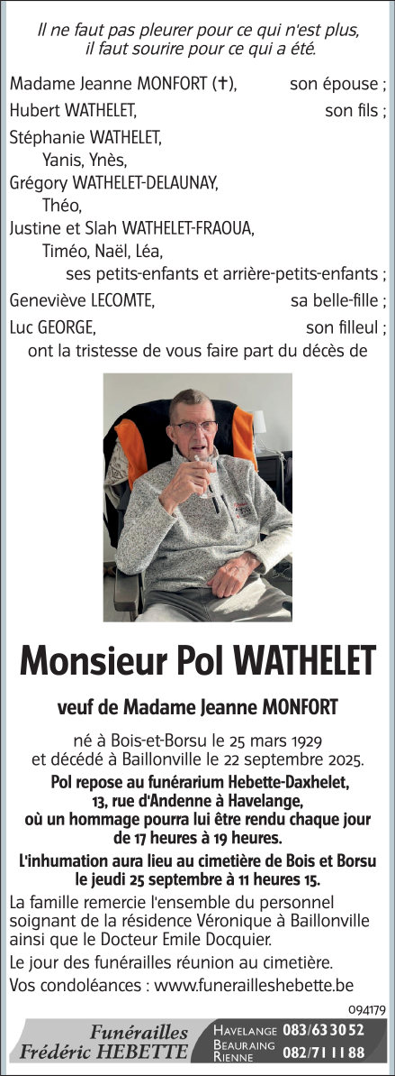 Décédé à Baillonville (5377, Belgique) le lundi 22 septembre 2025 à l'âge de 96 ans
